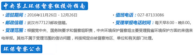 2016年11月26日至12月26日,中央第三环境保护督察组对湖北省开展了环境保护督察,形成了《湖北省环境保护督察反馈意见》(以下简称《反馈意见... 【详情】